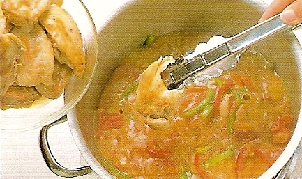Оставьте потомиться на медленном огне 10 минут не накрывая крышкой. 3.Добавьте ранее обжаренные куски курятины и оставьте на медленном огне минут 20 не накрывая крышкой.