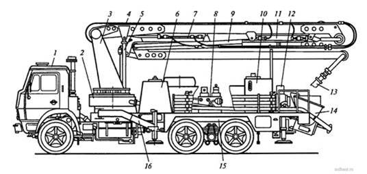 Автобетононасос (рис. 2) подает товарный бетон в горизонтальном и вертикальном направлениях к месту укладки с помощью распределительной стрелы 4 с бетоноводом 9 или инвентарного бетоновода. Распределительная стрела состоит из трех шарнирно сочлененных секций, движение которым в вертикальной плоскости сообщается гидроцилиндрами двустороннего действия 5, 7 и 11. Стрела монтируется на поворотной колонне 3, опирающейся на раму 15 шасси 1 через опорно-поворотное устройство 2, поворачивается в плане на 360° гидравлическим поворотным механизмом и имеет радиус действия до 19 м. На шасси также монтируются гидробак 6 и бак для воды 10. Прикрепленный к стреле шарнирно сочлененный секционный бетоновод 9 заканчивается гибким шлангом 3. Бетонная смесь подается в приемную воронку 14 бетононасоса 8 из автобетоносмесителя или автобетоновоза. При работе автобетононасос опирается на выносные гидравлические опоры 16. Автобетононасосы имеют переносной пульт дистанционного управления движениями стрелы, расходом бетонной меси и включением - выключением бетононасоса, что позволяет машинисту находиться вблизи места укладки смеси.