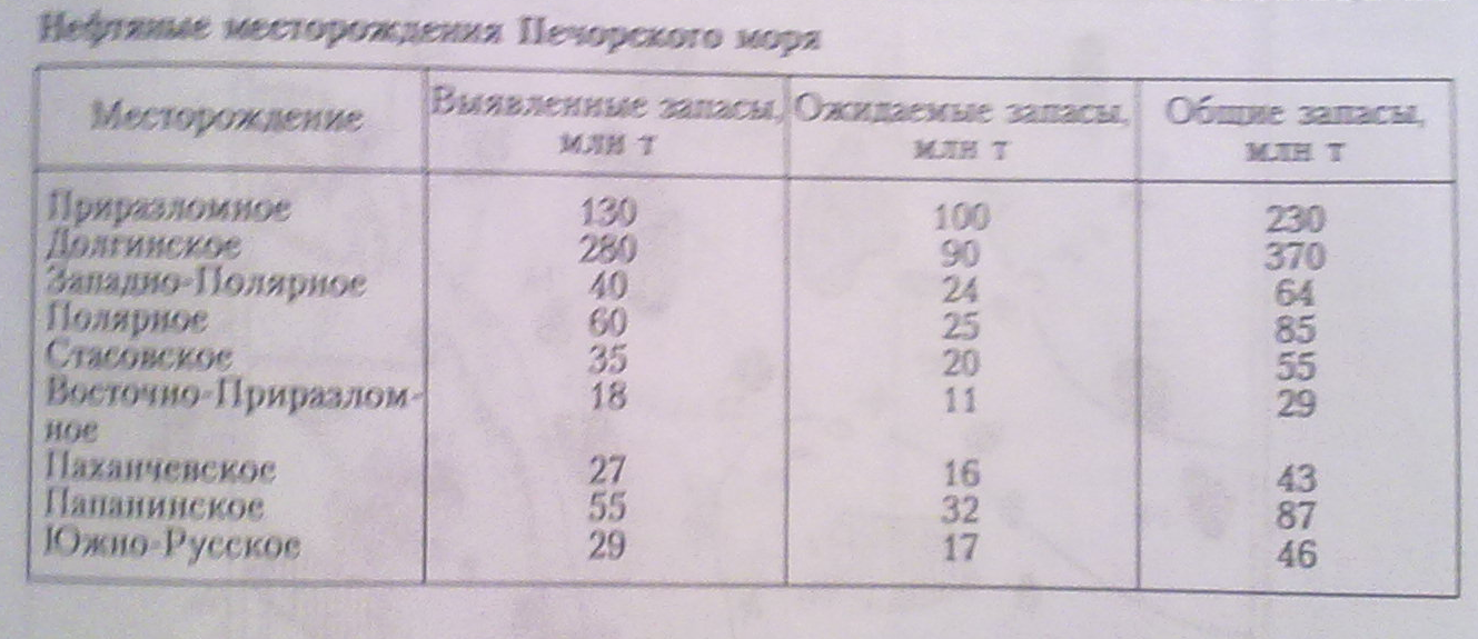Печорское море, по существу, является частью Баренцева моря. Поэтому данные о месторождениях Печорского моря приведены вместе с данными Баренцева моря. Характерной особенностью печорских месторождений является то, что большинство из них нефтяные, хотя имеются также нефтегазовые и газоконденсатные месторождения. Схемы печорских месторождений, морские нефтяные месторождения являются продолжением сухопутных(прибрежных) нефтяных месторождений. Общий объем разведанных запасов нефти на месторождениях Печорского моря превышает один миллиард тонн. По мере проведения исследований этот объем будет увеличиваться. Если учесть и газовые месторождения в миллионах тонн условного топлива, то общие запасы нефтяных и газовых месторождений составляет 10 800 млн т, а извлекаемые –около 5 000 млн т. Данные о запасах нефти в акватории Песерского моря – Приразломное, Долгинское. Кроме нефтяных имеются и нефтегазоконденсатное Северо-Гуляевское и газоконденсатное Поморское.