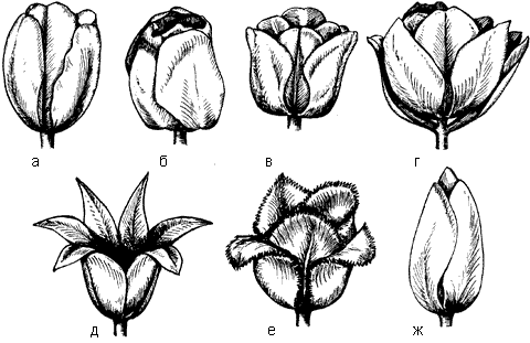 Рис. 7. Формы цветков тюльпана: а – ранние немахровые; б – поздние немахровые; в – триумф; г – ранние махровые; д – лилиецветные; е – бахромчатые; ж – дарвиновы гибриды