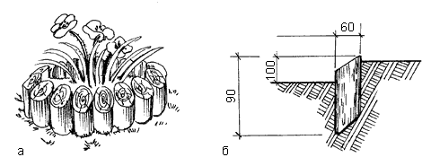 Рис. 43. Бордюр из подтоварника: а – общий вид; б – способ укладки