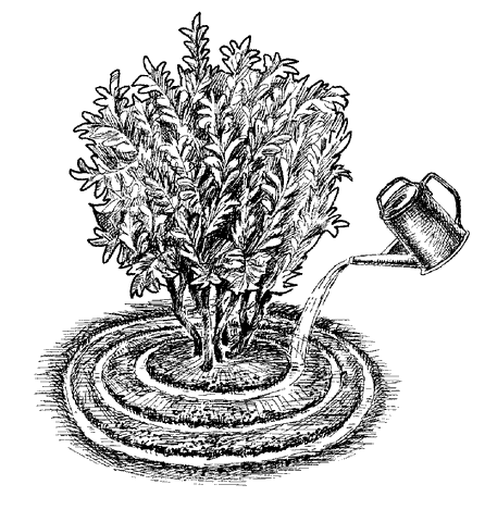 Цветочное оформление включает в себя принципы как ландшафтного дизайна, так и изобразительного искусства. Декоративные растения можно представить в виде палитры красок, которая дает возможность создания из цветников, клумб, живых изгородей художественных образов, в зависимости от фантазии и вкуса. В качестве композиционных элементов можно использовать однолетние, двулетние и многолетние травянистые растения. Это могут быть красивоцветущие, лиственно-декоративные пряморастущие, вьющиеся, а также почвопокровные виды. В цветочном оформлении также могут использоваться деревья и кустарники, требующие тщательного ухода, но зато цветущие на протяжении всего вегетационного периода. Основными принципами при создании цветочной композиции являются биологическое и гармоническое единство, пропорциональность, масштабность, контрастность и ритмичность. Единство композиции подразумевает взаимосвязь всех ее элементов. Так, в центре должны находиться наиболее крупные и сложные элементы, сюда обращены основные акценты. По мере отдаления от центра композиционные элементы становятся более нейтральными. Перед тем как начать закладку цветника, следует его спроектировать на листе миллиметровой бумаги. При проектировании цветник делят на части в зависимости от выбранного вами типа. Во всех цветниках, за исключением клумб, как правило, выделяют три части. На заднем плане располагаются крупные растения, цветущие со второй половины лета до осени, в середине – среднерослые виды высотой до 40 см, срок цветения которых начало—середина лета. На переднем плане размещают низкорослые многолетники. Луковичные высаживают в средней части цветника, чтобы прикрыть растения, теряющие после цветения декоративный вид. Большое внимание следует уделять выбору окраски растений и избегать несочетаемых цветовых решений. Таковыми являются пурпурный и фиолетовый, голубой и красный. Если же этих сочетаний избежать невозможно, то между ними высаживают растения нейтральных тонов – таких, как серый, кремовый, белый. При этом необходимо хорошо представлять смену цветовой палитры в зависимости от сроков цветения растений. Желательно, чтобы зеленый цвет не оставался преобладающим. После определения типа цветника (клумба, миксбордер, рабатка, бордюр, партер) и места его расположения проводят подготовку участка под посадку. Если почва на участке обеднена, в этом случае выкапывают котлован глубиной 35–50 см – под многолетники и меньшей глубины – под однолетники и ковровые растения. Заполняют его слоем плодородной почвы и удобряют органическими и минеральными удобрениями, удаляют сорняки. За день до посадки почву под цветник обильно поливают и высаживают растения только после того, как она осядет. После полива почву следует порыхлить и выровнять. Оптимальное время для посадки растений – пасмурный день или утренние и вечерние часы. В жаркие ясные дни саженцы нужно прикрыть от попадания на них прямых солнечных лучей. Сразу после посадки цветник обильно поливают, чтобы влага достигла глубины заделки корней и луковиц. Цветники требуют тщательного ухода. Ранней весной, после подсыхания верхнего слоя почвы, проводят рыхление и подкормку минеральными удобрениями (рис. 46), заделывая их на глубину 10–15 см. После этого обрезают и удаляют прошлогодние сухие побег