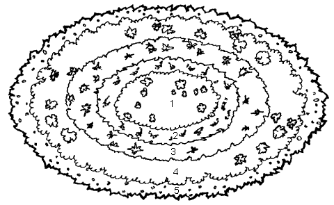 Рис. 49. Композиционная клумба для тенистых участков: 1 – астильба; 2 – бузульник; 3 – хоста; 4 – копытень европейский; 5 – барвинок