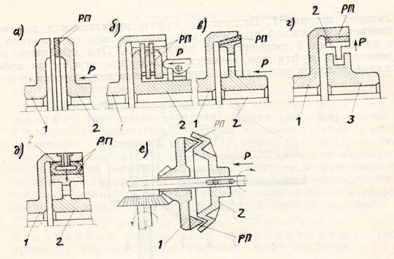 Рис.29. Муфты фрикционные: а – однодисковая; б – многодисковая; в – коническая; г – цилиндрическая; д - пневмокамерная; е – специальная коническая. Принцип работы этих муфт следующий: в дисковых и конических муфтах при перемещении подвижных полумуфт 2 в сторону в сторону неподвижных 1 с приложением осевого усилия Р между рабочими поверхностями РП возникает трение, обеспечивающее передачу вращающего момента; в цилиндрических муфтах необходимое трение создаётся при нажатии подвижных колодок (лент) 2 внутренней полумуфты 3 на рабочую поверхность РП охватывающей (наружной) полумуфты 1. В пневмокамерных муфтах требуемое трение создаётся увеличением объёма эластичной камеры 2 при подаче в неё сжатого воздуха давлением 5-7 кгс/см2. Пневмокамерные муфты просты по конструкции, обеспечивают плавное включение и, в отличие от рассмотренных выше муфт, не требуют регулировок, т.к. по мере износа трущихся рабочих поверхностей ход камеры увеличивается автоматически. Для обеспечения высокого и устойчивого при нагреве коэффициента трения и работы муфт без задиров на рабочие поверхности их подвижных частей приклеиваются или приклёпываются накладки (ленты) из фрикционного материала. Перемещение подвижных дисковых или конических полумуфт производится отводками, как у кулачковых муфт, или с помощью гидро-пневмоцилиндров, перемещение подвижных частей цилиндрических муфт производится обычно гидро- или пневмоцилиндрами. Каждая муфта имеет устройство, удерживающее её во включённом состоянии и не допускающее трения подвижных частей о неподвижные после выключения муфты. Обгонные муфты (рис.30), называемые также муфтами свободного хода, предназначены для передачи вращающего момента ведомому валу только в одном направлении и автоматического сцепления и расцепления валов в зависимости от соотношения их угловых скоростей. Работает муфта по принципу самозаклинивания. При вращении ведущей полумуфты 1 по часовой стрелке ролики 3, отжимаемые пружинными толкателями 4, будут заклиниваться и передавать вращающий момент полумуфте 2 (муфта включена).