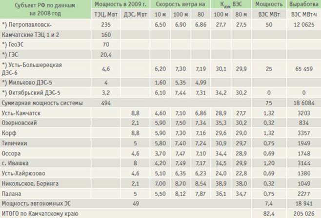 Масштабы использования ВЭС в РФ с учетом установленных экономических преимуществ над традиционными источниками энергии и имеющихся в стране ветровых ресурсов ограничены лишь потребностями в электроэнергии и технологическими и производственными ограничениями. К последним относятся ограничения темпов ввода ВЭС, связанные с возможностями импорта оборудования, организацией собственного производства ВЭУ и их ремонтной инфраструктуры, подготовкой кадров и пр. [2]. Исходя из мировых темпов развития и имеющегося в России кадрового, технологического и производственного уровня авторам представляются целесообразными рубежи развития и темпы их достижения, соответствующие средним темпам развития ветроэнергетики в Испании, Индии, Франции. При этом к 2020 и 2030 годам суммарная мощность ВЭС с себестоимостью ЭлЭн не выше 5–5, 5 euro-ц/кВт.ч в РФ может составить до 6, 5–7 ГВт в 2020 году и до 30–35 ГВт в 2030 году. С учетом потребностей страны в наращивании генерирующих мощностей, ветроэнергетических ресурсов и установленной высокой эффективности современных ВЭС, а также при принятии правовой базы, эффективно регулирующей взаимоотношения в электроэнергетике между генерирующими и сетевыми компаниями внутри субъекта и между субъектами РФ, суммарная выработка ВЭС к 2030 году может достигать 80–85 млрд кВт.ч (до 5, 5% потребления ЭлЭн в России в 2030 году). Перспективные районы и возможные объемы использования ВЭС до 2020 года в России в целом и в отдельном субъекте РФ (на примере Камчатского края) даны в таблице 1 и 2. Полученные результаты предлагаются авторами в качестве основы для разработки генеральной схемы размещения ВЭС в России до 2020 года.