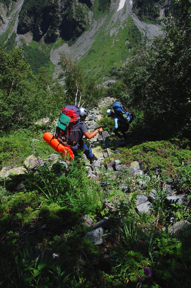 Стежка перевалює через відріг та спускається у сусідню бічну долину по крутому трав'янистому схилу. УВАГА! Після ніши з озерцем требатраверсувати схил гори Дорбун-Кая під перевал Дорбун, та вийти там на стежку яка їде донизу. Унизу серед субальпійського високотрав’я на березі чистого струмка можна розбити намет (висота - 2350 м). Сюди ж спускаються і після проходження перевалу Дурицького (1А). Спуск в ущелину ріки Аманауз проходить уздовж струмка. У тому місці, де він зривається зі скельного уступу, треба перейти на лівий берег та іти до сосен. Далі варто обійти праворуч скелі над струмком. Завершується спуск на дно ущелини по гребеню старої морени, що поросла криволіссям. Вище описаний спуск з перевалу Браконьєрів нами не випробувано, так як ми допустили помилку і від озера розпочали спуск прямо в долину річки Аманауз. Від озера стежки не видно. Доречно зробити вагому розвідку та дотримуватись вище описаного шляху. Видно, що не одна група допускається такої помилки. Нами було знайдено ледоруб та папку з документами Саратовської групи, яка у квітні 2011 р. теж блукала цими місцями. Вони йшли гірську 4 категорію. В результаті на спуску до р. Аманауз ми подолали трав’яний схил у 35-40 градусів, вимотались у буковому жерепі, використали дві мотузки по 50 м (спуск спортивним способом: фото 23, 24). Опинились затиснуті у скелях бурхливої ріки у суцільних заростях борщовика. Обхід скельних прижимів проходив по досить стрімких підйомах з використанням мотузки (3 рази по 50 м). На нас летіло каміння з верху. Під час обходів прижимів на учасника зсунувся камінь ледь не ушкодивши ногу. Камінь придав рюкзак, визволення якого зайняло 30 хв. P.S. Дня Все це закінчилось майже «сидячою» ночівлею на крутому схилі у прорубаному буковому жерепі. Воду набирали з допомогою медицинської трубки від крапельниці. Проте, ці події яскраво житимуть в нас завжди! Таке враження що ми злились з цією природою в одне ціле. Все що оточує - біжить по наших судинах, наповнює тіло солодким наркотичним кайфом!!! Кругом дикий, непрохідний, небезпечний, суровий, бурхливий, квітучий, зелений та біло-холодний, весь з контрастів, піків вершин, озер, водоспадів, каменепадів, досить витончений, дуже гарний, Західний КАВАКАЗ. І ми, зграйка 9-ти сердець десь на одному із крутих схилів... у самому серці Кавказу. За цими відчуттями потрібно прийти ще!!! Їх не знайдеш як не шукай ніде. Вони живуть лише ТУТ!!!