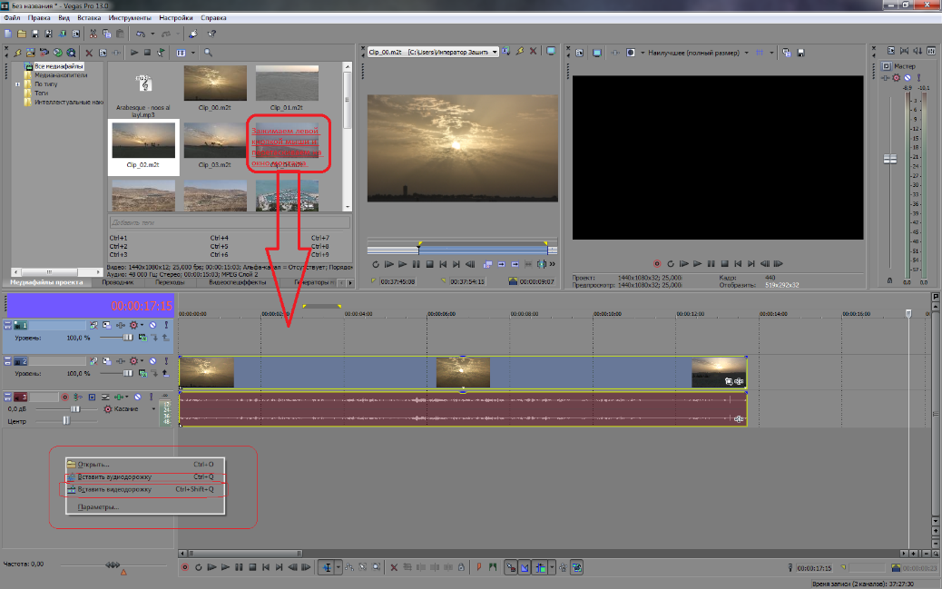Вы спросите, что ты сейчас нам втираешь, ни черта же не понятно, без паники друзья! Конечно будет непонятно если просто рассказывать, а не показывать, но пока я просто ввожу вас в курс дела. А вот когда мы начнем с каждым этим инструментом работать уже непосредственно в нашем проекте, вы быстро все поймете и запомните. Тогда вопрос, а почему сейчас не показать, как это работает? Просто тогда урок будет длится три часа, и такой поток информации плохо усвоится в вашей голове. Можно вывалить все сразу и разобрать Sony Vegas за уроков 5, но эта будет куча непонятных для вас данных, а так мы плавно разберем все что может дать эта программа и к тому же научимся профессионально на ней работать. Поэтому не забывайте подписаться на канал, рассказать друзьям, ставить лайки, ну и вступать в группу ВК. Мы уже добавили видео на ленту монтажа, и у нас появилась две дорожки аудио и видео. Sony Vegas может создавать только эти два типа дорожек, все графические элементы будь то титры картинки, вставляются в видео дорожку, дорожка звука содержит только звуковые файлы. Помимо добавления самого файла на стол монтажа и этим создания новых дорожек, их можно добавить воспользовавшись способом → Щелкаем правой кнопкой мыши в область заголовков видео → в появившемся меню выбираем вставить аудио или видеодорожку → или воспользоваться быстрыми клавишами Cntr+Q (звуковая) Cntr+Shift+Q (видео).