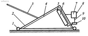 Рис. 7. Схема регенерационной установки «РМКЛ»: 1 - опорные колеса; 2 - корпус; 3 - руль; 4 – отражающий экран; 5 – верхние токопроводящие шины; 6 – нагревательный блок; 7 – электрический щиток; 8 – кнопка включения; 9 – токопровод; 10 – токоподводящая шина
