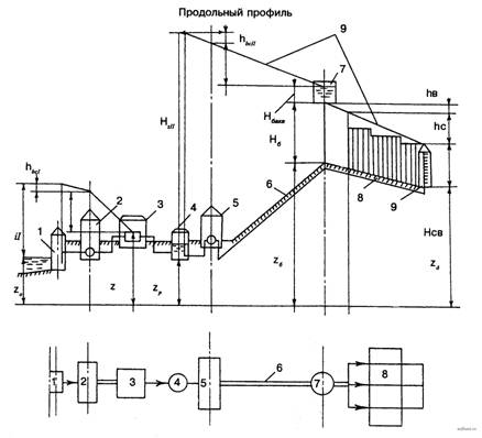 Под схемой водоснабжения понимают генеральный план объекта водоснабжения с указанными на нем всеми водопроводными сооружениями. Проектирование схем водоснабжения осуществляется на основе генеральных планов городов (первая очередь на срок 8-10 лет и перспектива на срок 20-25 лет) и промышленных предприятий. Схема водоснабжения зависит от многих факторов, из которых главными являются следующие: расположение, мощность и качество воды источника водоснабжения, рельеф местности и кратность использования воды на промышленных предприятиях. Схема водоснабжения города состоит из следующих основных элементов: 1) водоприемных сооружений; 2) водоподъемных сооружений, т.е. насосных станций, подающих воду к очистным сооружениям (насосная станция I подъема) или потребителям (насосная станция II подъема); 3) очистных сооружений; 4) башен и резервуаров, накапливающих запасы воды или регулирующих напоры и расходы; 5) водоводов и сети трубопроводов, предназначенных для транспортирования воды от сооружения к сооружению или к потребителям. На рис. 1 показана схема водоснабжения города с поверхностным источником. Из источника вода забирается водоприемным сооружением и подается насосами насосной станции I подъема на очистные сооружения. После очистки и обеззараживания вода собирается в резервуарах чистой воды. Затем насосами насосной станции II подъема вода подается по водоводам 6 в сеть трубопроводов 8, разводящую воду потребителям.