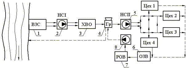 1 – водозаборное сооружение; 2 – насосная станция 1-го подъема; 3 – станция очистки природной воды; 4 – охлаждающая установка; 5 – насосная станция 2 подъема; 6 – станция очистки загрязненных вод; 7 – резервуар очищенной воды; 8 – насосная станция оборотной воды. Рисунок 1.3 – Оборотная схема СПВ При работе оборотной системы часть воды теряется: с уносом, испарением и продувкой из охлаждающих устройств; с утечками через неплотности и за счет сброса в канализацию воды загрязняющейся у потребителя примесями, не разрешающими ее повторное использование. Для компенсации этих потерь из природного источника забирается соответствующее количество воды и насосами НС1 направляется на станцию ХВО. Очищенная вода сливается в бассейн охлаждающих устройств. Для поддержания солевого баланса из бассейна ведется непрерывная продувка части воды в канализацию. Оборотные системы сооружаются как по техническим условиям, экологическим требованиям и экономическим соображениям. По техническим условиям применения данной системы может оказаться просто необходимо потому, что дебет имеющегося природного водоисточника недостаточен для осуществления прямоточного водоснабжения. Необходимость оборотных систем обуславливается и экологическими требованиями. Применение оборотных систем позволяет снизить количество сбросов загрязненной воды в водоемы. Наиболее ценны с экологической точки зрения оборотные системы без сброса продувки – бессточные системы. В бессточных (замкнутых) системах водоснабжения на предприятиях вместо свежей воды используется доочищенная до норм качества технической воды смесь промышленных и бытовых сточных вод, предварительно прошедшая биологическую очистку. Биологически очищенные сточные воды, используемые в техническом водоснабжении, должны отвечать техническим, экономическим и санитарно-гигиеническим требованиям. Но и при соблюдении соответствующих норм такая вода не может использоваться в пищевой, мясомолочной и фармацевтической промышленностях. Из экономических соображений использование оборотных систем водоснабжения позволяет снизить затраты на сооружение водозаборных устройств, насосных станций первого подъема, водоводов, очистных сооружений природной воды и канализационных линий.