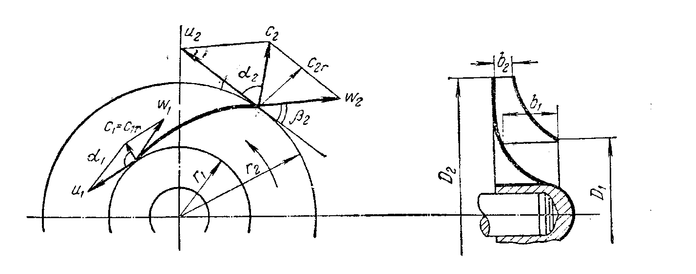 Q = b1(π D1 - δ z)c1r = b2(π D2 - δ z)c2r b1 b2 – ширина рабочего колеса на внутренней и внешней окружностях соответственно, c1r с2r – радиальные составляющие абсолютных скоростей на входе в колесо и выходе из него. Производительность и напор центробежного насоса зависят от числа оборотов рабочего колеса. Из уравнения следует, что производительность насоса прямо пропорциональна радиальной составляющей абсолютной скорости на выходе из колеса.
