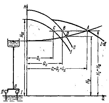 Параллельное соединение насосов обычно применяют для увеличения подачи. Насосы, работающие параллельно на один длинный трубопровод, обычно устанавливают близко один от другого, в пределах одного машинного зала. Так как насосы II и I находятся близко один от другого, а трубопровод, на который они работают, длинный, можно пренебречь сопротивлением подводящих и напорных трубопроводов до узловой точки О. Пусть приемные уровни обоих насосов одинаковы. При этом напор насосов одинаков, так как одинаково давление в точке О, создаваемое обоими насосами. Заменим оба насоса одним, имеющим подачу, равную сумме подач обоих насосов, взятых при одинаковом напоре. При такой замене режим работы насосной установки не изменится. Для получения характеристики этого насоса или суммарной характеристики двух насосов, следует сложить абсциссы точек кривых напора Н = f (Q) обоих насосов, взятых при одной и той же ординате. Иными словами, следует сложить кривые напоров I и II обоих насосов по горизонтали. Пересечение суммарной характеристики I + II с характеристикой насосной установки дает рабочую точку А. Абсцисса точки А равна суммарной подаче обоих насосов, ордината — напору насосов Н1 = Н2. Проведя через точку А горизонтальную прямую, получим на пересечении с кривыми I и II напоров режимные точки С и В насосов I и II.