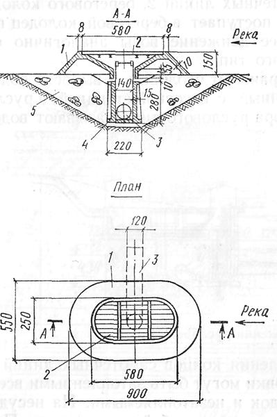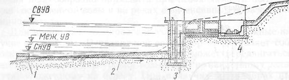Водозаборные сооружения руслового типа устраивают при сравнительно пологих берегах, слабых грунтах и малых глубинах воды в реке Схема водозабора этого типа приведена на рис. II.15. Водозабор состоит из оголовка 1, самотечных линий 2, берегового колодца 3 и насосной станции 4. Вода поступает в береговой колодец по самотечным линиям. Дальнейшее движение воды аналогично ее движению в водозаборе берегового типа.