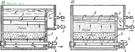Фильтрование составляет последний этап осветления воды и производится после предварительного осветления воды в отстойниках или осветлителях. Процесс заключается в пропускании воды через слой мелкозернистого фильтрующего материала (речного или карьерного песка, дробленого антрацита). Для очистки воды применяют фильтры скорые и медленные: скорые — с коагулированием воды, медленные — для обработки ее без коагулирования. Для частичного осветления исходной воды с мутностью до 300 мг/л, используемой на производственные нужды, следует применять глубокозернистые фильтры. По принципу действия и виду загрузки скорые фильтры разделяют на фильтры по направлению движения воды сверху вниз (однопоточные) и с одновременным движением сверху вниз и снизу вверх (двухпоточные). Однопоточные фильтры бывают с загрузкой из однородного фильтрующего материала (однослойные), с загрузкой из различных фильтрующих материалов (двухслойные фильтры). Фильтры бывают безнапорные (открытые) и напорные (закрытые). Безнапорные скорые фильтры называют также самотечными. Безнапорные скорые фильтры. Скорыми называют те фильтры, через которые вода проходит со скоростями 6—10 м/ч и более.