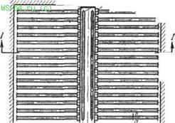 Рис. 64. Схема трубчатого дренажа большого сопротивления На станциях фильтрования воды для улучшения процесса промывки фильтрующего материала применяют дополнительно поверхностную промывку (рис. 65) — смыв с фильтра. В последнее время разработано много новых конструкций дренажных устройств, в частности щелевые колпачковые дренажи. Эти дренажи дают возможность отказаться от поддерживающих слоев гравия, из-за чего уменьшается высота и, следовательно, стоимость фильтра. Фильтры двухпоточные. Академией коммунального хозяйства РСФСР разработан фильтр, названный двухпоточным или фильтром АКХ. Фильтры этой конструкции имеют производительность в 1, 5 раза большую по сравнению с открытыми скорыми фильтрами, т. е. условно-расчетную скорость фильтрации принимают 12—15 м/ч.