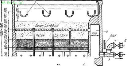 Рис. 66 а. Фильтр двухпоточный (конструкции АКХ РСФСР): 1—желоб; 2 — трубы распределительной системы; 3 — щелевой дренаж; 4 — канал чистой воды: б— выход осветленной воды; 6 — промывная вода Основная масса воды проходит тело фильтра снизу вверх. Часть воды, поступающей по желобам 1, фильтруется сверху вниз (рис. 66 а). Профильтрованная вода отводится трубчатым дренажом 3, устраиваемым из щелевых асбестоцементных или винипластовых труб. Промывная вода подается в дренаж для взрыхления верхнего слоя песка с интенсивностью 6—8 л/сек на 1л*2. Затем промывная вода подается в распределительную систему 2 для промывки всего слоя загрузки с интенсивностью 13 — 15 л/сек/м2 в течение 5—6 мин. Загрязненная вода сбрасывается в водосток по желобу 1, карману 4 и трубе 6.
