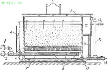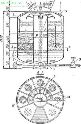 Рис. 67 а. Контактный осветлитель: 1 — зернистая загрузка; 2— подача исходной воды; 3— подача промывной воды; 4 — подача раствора коагулянта; 5 — воздушные трубы; 6 — смесительная шайба; 7 — колосниковая решетка; «—распределительные дырчатые трубы; 9— разборный' настил; 10 — сборный канал; 11 — отвод промывной воды; 12 — спускная труба; 13 — отвод осветленной воды; 14 — переливная труба; 15— сток