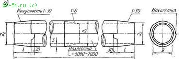 Рис. 40. Гибкое стыковое соединение, разработанное во ВНИИ ВОДГЕО: 1 — тело трубы; 2 — тонкостенный стальной цилиндр; 3 — спиральная напряженная арматура; 4 — обечайка гладкого конца трубы; 5 — раструбная обечайка; 6 — резиновое кольцо Трубы из других материалов. Фанерные трубы. Хорошие результаты достигнуты в изготовлении фанерных труб. Изготовляют их навиванием двуслойной фанеры, слои которой в стенах труб склеены фенолформальдегидным клеем. Фанерные трубы (рис. 41, а) изготовляют согласно ГОСТ 7017—54 двух марок: Ф-1 и Ф-2 с внутренним диаметром от 50 до 300 мм, при толщине стенок от 86, 5 до 13 мм, длиной 5—7 мм. Величина рабочего давления для труб Ф-1 от 3 до 5 ати, для труб Ф-2 от 6 до 10 ати. Согласно ГОСТ 7017—54 трубы изготовляют с защитным покрытием от химического воздействия и гниения. Соединение труб производится конусными муфтами (рис. 41, б), герметичность достигается плотностью посадки. Производят соединение при помощи металлических фасонных частей. Вес фанерных труб и теплопроводность меньше металлических, пропускная способность больше, монтаж проще и дешевле металлических. Эти трубы нельзя применять для подачи воды питьевого качества.