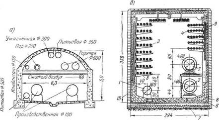 Рис. 42. Тоннели с трубопроводами: а — устраиваемые на предприятиях; б— в крупных городах; 1 — водопровод; 2—теплофикация; 3 и 4 — кабели; 5 — кронштейны; 6 — подготовка; 7—щебенка; < У — сборный железобетон; 9 — кирпичная облицовка; 10 — изоляционный слой По санитарно-гигиеническим условиям канализационные трубопроводы в тоннелях укладывать нельзя. Тоннели обеспечивают надежность эксплуатации, так как предохраняют трубы от почвенной коррозии и влияния на них блуждающих токов и позволяют быстро вести ремонт большого числа подземных трубопроводов и других коммуникаций. Типовые конструкции тоннелей из сборных железобетонных блоков, изготовляемых на бетонных заводах, разработаны Мосподземстроем. Тоннели могут быть проходные (не менее 1, 8 м высоты) и полупроходные (не менее 1, 3 м высоты). Трубопроводы помещают в тоннелях по стенам на кронштейнах, опорах, стеллажах, а иногда подвешивают к перекрытию.