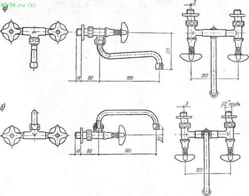 Рис. 118. Смесители: а— для мойки с верхним изливом; б — то же, с нижним изливом;