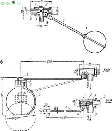 Рис. 119. Шаровой кран: а — металлический; б — из пластмассы; 1 — корпус; 2 — золотник; 3 — рычаг; 4 — резина золотника; 5 — штуцер: в — ось; 7 — поплавок; 8 — крышка; 9 — резиновая прокладка