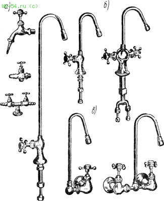 Арматуру, устанавливаемую на внутренних водопроводных сетях, по назначению подразделяют на водоразборную, запорную, регулировочную, предохранительную и специальную (медико-санитарную и лабораторную). Водоразборную арматуру устанавливают над санитарными приборами для разбора воды из водопроводной сети. Вся водоразборная арматура (за исключением пробочных кранов) применяется вентильного типа с медленным (постепенным) открыванием для предохранения от гидравлических ударов и от разбрызгивания воды. Водоразборная арматура. Водоразборный кран нового типа «уточка» (ГОСТ 8906—58, рис. 116, а) имеет излив более удлиненной формы, чем кран старой конструкции. Благодаря этому расстояние от стенки раковины или мойки до изливного носика увеличивается, что удобно для пользования.