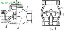 Рис. 125. Обратные клапаны: а — тарельчатый; б— с захлопкой; 1— корпус) 2— клапан: 3 — направление потока Обратные клапаны тарельчатые (рис. 125, а) и «захлопка» (рис. 125, б) устанавливают в тех случаях, когда в трубе допустимо движение воды только в одном направлении. При движении воды в требуемом направлении она приподнимает золотник или клапан и свободно проходит через него; при течении в обратном направлении золотник или клапан прижимается водой к седлу и закрывает проход.