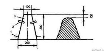 Рис. 1. Определение удобоукладываемости бетонной смеси по осадке конуса: 1 — опоры; 2 — ручки; 3 — конус; ОК — осадка конуса Усеченный конус изготовляют из тонкой листовой стали. Размеры конуса: высота 300 мм, диаметр нижнего основания 200, верхнего — 100 мм. Конус устанавливают на горизонтальной площадке, не впитывающей влагу. Берут пробу бетонной смеси, например, из авто-бетоносмесителя. Конус наполняют в три приема, каждый раз уплотняя смесь 25 ударами металлического стержня-штыковки. Поверхность смеси заглаживают, затем конус снимают и устанавливают рядом. Под действием силы тяжести бетонная смесь деформируется и оседает. Разность высот металлической формы конуса и осевшей бетонной смеси, выраженная в сантиметрах, характеризует подвижность смеси и называется осадкой конуса (ОК). С помощью этого показателя оценивают подвижность пластичных бетонных смесей. Жесткость бетонной смеси характеризуется временем вибрирования, необходимым для выравнивания и уплотнения предварительно отформованного конуса бетонной смеси в приборе для определения жесткости. Жесткость смесей, у которых значение ОК = 0, характеризуют показателем жесткости, определяемым на приборе (рис. 2), который представляет собой металлический цилиндр 2 диаметром 240 мм и высотой 200 мм. Цилиндр устанавливают на лабораторную виброплощадку со стандартными характеристиками частоты (50 Гц) и амплитуды колебаний (0, 5 мм в ненагруженном состоянии). Затем в цилиндр вставляют конус 3 и заполняют его бетонной смесью так же, как и при определении подвижности. После этого конус снимают и, поворачивая штатив, опускают стальной диск 4 на бетонную смесь. Общая масса диска с шайбой и штангой составляет около 2750 г, что создает при уплотнении пригруз 0, 9 кПа. Включив виброплощадку, смесь подвергают вибрации до тех пор, пока цементное тесто не начнет выделяться из всех отверстий диска. В этот момент вибратор выключают. Время, необходимое для уплотнения смеси в приборе, называют показателем жесткости бетонной смеси (Ж) и выражают в секундах.