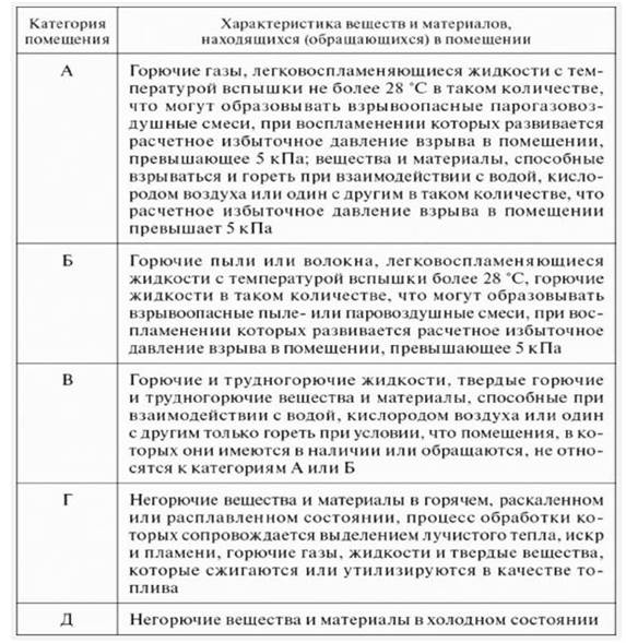 ОГНЕСТОЙКОСТЬ ЗДАНИЙ И СООРУЖЕНИЙ Степень огнестойкости зданий и сооружений определяется минимальными пределами огнестойкости строительных конструкций и возгораемостью строительных материалов. Несгораемые материалы — материалы, которые под воздействием огня или высокой температуры не воспламеняются, не тлеют и не обугливаются (кирпич, асбест, глина, битум и пр.). Трудно сгораемые материалы — материалы, которые под воздействием огня или высокой температуры с трудом воспламеняются, тлеют или обугливаются и продолжают гореть при наличии источника огня (асфальтобетон, цементный фибролит, древесина, пропитанная антипиринами, войлок, вымоченный в глиняном растворе, и проч.). Сгораемые материалы — материалы, которые под воздействием огня или высокой температуры воспламеняются или тлеют и продолжают гореть и тлеть после удаления источника огня (органические материалы, не пропитанные антипиринами, битуминозные и проч.). Легковоспламеняющиеся материалы — материалы типа ваты, синтетического клея, монтажной пены, синтетических тканей. Огнестойкость конструкций характеризуется пределом огнестойкости, который определяют следующие признаки: • образование в конструкции трещин или отверстий, сквозь которые проникают продукты горения или пламя; • повышение температуры на обогреваемой поверхности конструкции в среднем более чем на 140°С; • потеря конструкцией своей несущей способности; • переход горения в смежные конструкции или помещения; • разрушение узлов крепления конструкции. По степени огнестойкости строительных конструкций здания и сооружения подразделяются на 5 категорий — I, II, III, IV, V (по мере уменьшения качеств). Повышению огнестойкости зданий и сооружений способствуют: • облицовка или оштукатуривание металлических конструкций, например, гипсовыми плитами; • оштукатуривание деревянных конструкций известково-цементной, асбе-стово-цементной или гипсовой штукатуркой; • огнезащитная пропитка древесины антипиринами — химическими веществами (фосфорнокислый аммоний, сернокислый аммоний), придающими негорючесть; • покрытие конструкций огнезащитными красками; • замена деревянных конструкций (полов, лестниц, стен) кирпично-бетонными, керамическими и т. п. Помещения подразделяют на пять категорий в зависимости от характера веществ и материалов, находящихся в них (табл. 1). Категории помещений