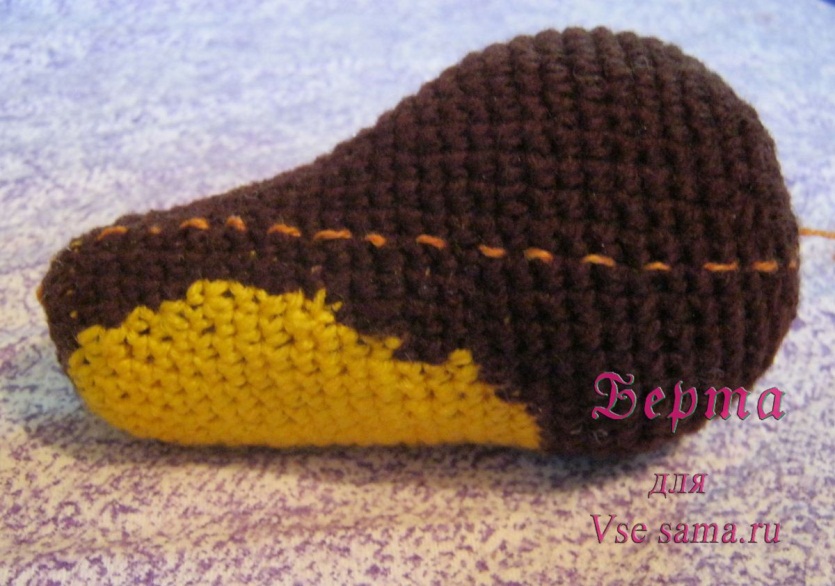 Добавляем жёлтую нить 4 р. - коричневый (кор) - 3 сбн. приб; жёлтый (ж) - (2 сбн. приб) - 2 раза, 2 сбн; кор. - приб, 3 сбн - 20 сбн 5 р. - кор. - 4 сбн, приб, 1 сбн; ж. - 1 сбн, приб, 3 сбн, приб, 3 сбн. приб, 1 сбн; кор. - 1 сбн, приб. 2 сбн - 26 сбн 6 р. - кор. - 7 сбн; ж. - 15 сбн; кор. - 4 сбн - 26 сбн 7 р. - кор. - 7 сбн; ж. - 7 сбн, приб, 7 сбн; кор. - 4 сбн - 27 сбн 8 р. - кор. - 7 сбн; ж. - 16 сбн; корю - 4 сбн - 27 сбн 9 р. - кор. - 7 сбн, приб; ж. - 16 сбн; кор. - 4 сбн - 29 сбн 10 р. - кор. - 8 сбн, приб; ж. - 8 сбн, приб, 8 сбн; кор. - 3 сбн - 31 сбн 11р - кор. - 10 сбн; ж. - 19 сбн; кор. - 2 сбн - 31 сбн 12 р. - кор. - 11 сбн; 9 сбн, приб, 8 сбн; кор. - 2 сбн - 32 сбн 13 р. - кор. - 12 сбн; ж. - 18 сбн; кор. - 2 сбн - 32 сбн 14 р. - кор. - 5 сбн, приб, 5 сбн, приб; ж. - уб, 7 сбн, приб, 8 сбн; кор. - 2 сбн - 34 сбн 15 р. - кор. - 13 сбн, приб; ж. - уб. 16 сбн; кор. - 2 сбн - 34 сбн 16 р. - кор. - 6 сбн, приб, 7 сбн; приб; ж. - уб, 6 сбн, приб, 7 сбн; кор. - 2 сбн - 35 сбн 17 р. - кор. - 18 сбн; ж. - 14 сбн; 4 кор. - 3 сбн - 35 сбн 18 р. - 4 сбн, приб, 5 сбн, приб, 7 сбн; ж. - 14 сбн; кор. - 3 сбн - 37 сбн 19 р. - кор. - 9 сбн, приб, 11 сбн; ж. - 12 сбн; кор. - 4 сбн - 38 сбн 20 р. - кор. - 4 сбн, приб, 8 сбн, приб, 9 сбн; ж. - 12 сбн; кор. - 3 сбн - 40 сбн 21 р. - кор. - 27 сбн; ж - 9 сбн; кор. - 4 сбн - 40 сбн 22 р. - кор. - 27 сбн; ж. - 8 сбн; кор. - 5 сбн - 40 сбн 23 р. - кор. - 13 сбн, приб, 13 сбн; ж. - 2 сбн, приб, 1 сбн, приб, 3 сбн; кор. - 5 сбн - 43 сбн Жёлтую нить отрываем, дальше вяжем только коричневым: 24 р. - 7 сбн, приб, 11 сбн, приб, 23 сбн - 45 сбн 25 - 28 р. - 45 сбн 29 р. - 35 сбн, уб, 8 сбн - 44 сбн 30 р. - 44 сбн 31 р. - 35 сбн, уб, 7 сбн - 43 сбн 32 р. - 12 сбн, уб, 29 сбн - 42 сбн 33 р. - 1 сбн, (уб, 6 сбн) - 5раз, уб. - - 37 сбн 34 р. - (5 сбн, уб) - 5 раз, 2 сбн - 32 сбн 35 р. - (4 сбн, уб) - 5 раз, 2 сбн - 27 сбн 36 р. - (уб, 3 сбн) - 5 раз, 2 сбн - 22 сбн 37 р. - (2 сбн, уб) - 5 раз, 2 сбн - 17 сбн Набиваем 38 р. - (1 сбн. уб) - 5 раз, 2 сбн - 12 сбн 39 р. - уб. - 6 раз - 6 сбн Стягиваем. Голова готова.