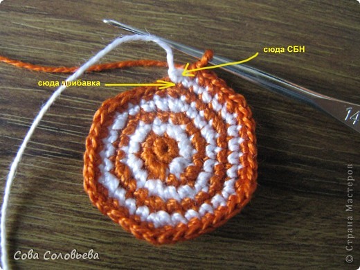 Далее вяжем по кругу, отдельно по очереди каждой нитью: Рыжим в белые петли (сбн, приб) 2 раза Белым в рыжие петли (сбн, приб) 3 раза Рыжим в белые петли сбн, приб, (2 сбн, приб) 2 раза Белым в рыжие петли (2 сбн, приб) 3 раза Рыжим в белые петли 2 сбн, приб, (3 сбн, приб) 2 раза Белым в рыжие петли (3 сбн, приб) 3 раза Рыжим в белые петли 3 сбн, приб, (4 сбн, приб) 2 раза Белым в рыжие петли (4 сбн, приб) 2 раза, 4 сбн, в следующую петлю сбн и соединительный столбик, белую нить оборвать. Рыжим в белые петли 4 сбн, приб, (5 сбн, приб) 2 раза, 5 сбн, прибавка в рыжую петлю (см. фото)