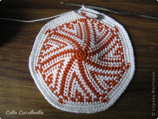 Основа узора на пузике – все прибавки выполняются нитью дополнительного цвета, получатся как бы лучи из центра. Все, что между лучами – на ваше усмотрение, можно хаотично вставлять цветные петли (как в моем случае), можно не делать лучи, а пустить спиральку, как на мотивах панциря, можно вообще сделать животик однотонным.