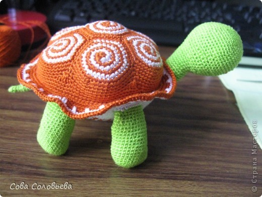 до конца не довязываем, оставляем дыру где-то между последней ногой и хвостом, и набиваем тушку. сначала животик (под каркасом), потом панцирь (над каркасом), начиная с дальнего края, так, чтобы рельефно выделились мотивы панциря. довязываем ряд до конца. да, на панцире у нас есть лишняя петля (живот 119 петель, а панцирь 120), прячем ее как-нибудь в районе хвоста в конце ряда, там не будет заметно. нить не обрываем, вяжем ею и дальше.