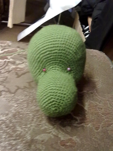 Как делается пуговичное крепление: в отверстие головы вставляем пуговицу с предварительно продетой ниткой, довязываем голову, закрываем петли, хвостик прячем, нить от пуговичного шарнира остается. Продеваем нить пуговичного шарнира через центр начала туловища. Продеваем концы нити через вторую пуговицу и крепко завязываем два узла. Продолжаем вязать туловище. ЭТАП № 2. ХВОСТ Каждый шар вяжется отдельно и присоединяется к предыдущему пуговичным креплением. Вяжем пряжей зеленого цвета. Набиваем в процессе вязания, на том этапе, на котором вам больше всего удобнее. 1 шар: 1 ряд: 6 сбн в кольцо амигуруми 2 ряд: 6 прибавок (12) 3 ряд: (сбн, прибавка) – 6 раз (18) 4 ряд: (2 сбн, прибавка) – 6 раз (24) 5 ряд: (3 сбн, прибавка) – 6 раз (30) 6 ряд: (4 сбн, прибавка) – 6 раз (36) 7 ряд: (5 сбн, прибавка) – 6 раз (42) 8 ряд: (6 сбн, прибавка) – 6 раз (48) 9 ряд: (7 сбн, прибавка) – 6 раз (54) Делаем пуговичное крепление (см. фото) 10 – 20 ряд: 54 сбн 21 ряд: (7 сбн, убавка) – 6 раз (48) 22 ряд: (6 сбн, убавка) – 6 раз (42) 23 ряд: (5 сбн, убавка) – 6 раз (36) 24 ряд: (4 сбн, убавка) – 6 раз (30) 25 ряд: (3 сбн, убавка) – 6 раз (24) 26 ряд: (2 сбн, убавка) – 6 раз (18) 27 ряд: (1 сбн, убавка) – 6 раз (12) 28 ряд: стягиваем 2 шар. 1 ряд: 6 сбн в кольцо амигуруми 2 ряд: 6 прибавок (12) 3 ряд: (сбн, прибавка) – 6 раз (18) 4 ряд: (2 сбн, прибавка) – 6 раз (24) 5 ряд: (3 сбн, прибавка) – 6 раз (30) 6 ряд: (4 сбн, прибавка) – 6 раз (36) 7 ряд: (5 сбн, прибавка) – 6 раз (42) 8 ряд: (6 сбн, прибавка) – 6 раз (48) Делаем пуговичное крепление (см. фото) 9 – 18 ряд: 48 сбн 19 ряд: (6 сбн, убавка) – 6 раз (42) 20 ряд: (5 сбн, убавка) – 6 раз (36) 21 ряд: (4 сбн, убавка) – 6 раз (30) 22 ряд: (3 сбн, убавка) – 6 раз (24) 23 ряд: (2 сбн, убавка) – 6 раз (18) 24 ряд: (1 сбн, убавка) – 6 раз (12) 25 ряд: стягиваем 3 шар: 1 ряд: 6 сбн в кольцо амигуруми 2 ряд: 6 прибавок (12) 3 ряд: (сбн, прибавка) – 6 раз (18) 4 ряд: (2 сбн, прибавка) – 6 раз (24) 5 ряд: (3 сбн, прибавка) – 6 раз (30) 6 ряд: (4 сбн, прибавка) – 6 раз (36) 7 ряд: (5 сбн, прибавка) – 6 раз (42) Делаем пуговичное крепление (см. фото) 8 – 16 ряд: 42 сбн 17 ряд: (5 сбн, убавка) – 6 раз (36) 18 ряд: (4 сбн, убавка) – 6 раз (30) 19 ряд: (3 сбн, убавка) – 6 раз (24) 20 ряд: (2 сбн, убавка) – 6 раз (18) 21 ряд: (1 сбн, убавка) – 6 раз (12) 22 ряд: стягиваем 4 шар: 1 ряд: 6 сбн в кольцо амигуруми 2 ряд: 6 прибавок (12) 3 ряд: (сбн, прибавка) – 6 раз (18) 4 ряд: (2 сбн, прибавка) – 6 раз (24) 5 ряд: (3 сбн, прибавка) – 6 раз (30) 6 ряд: (4 сбн, прибавка) – 6 раз (36) Делаем пуговичное крепление (см. фото) 7 – 14 ряд: 36 сбн 15 ряд: (4 сбн, убавка) – 6 раз (30) 16 ряд: (3 сбн, убавка) – 6 раз (24) 17 ряд: (2 сбн, убавка) – 6 раз (18) 18 ряд: (1 сбн, убавка) – 6 раз (12) 19 ряд: стягиваем
