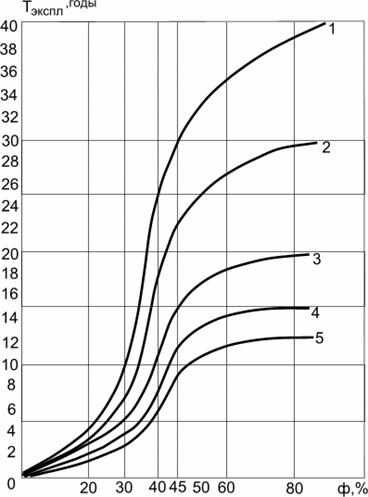 Рис. 2. Физический износ слоистых конструкций (срок службы 10-50 лет) n - число слоев. Пример оценки физического износа слоистой конструкции приведен в справочном прил.1. 1.7. Физический износ внутренних систем инженерного оборудования зданий в целом должен определяться по табл. 64-71 на основании оценки технического состояния элементов, составляющих эти системы. Если в процессе эксплуатации некоторые элементы системы были заменены новыми, физический износ системы следует уточнить расчетным путем на основании сроков эксплуатации отдельных элементов по графикам, приведенным на рис. 3 - 7. За окончательную оценку следует принимать большее из значений.
