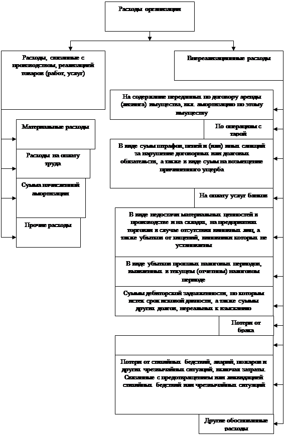 В целях налогообложения под расходами следует понимать любые обоснованные (экономически оправданные) и документально подтвержденные затраты, при условии, что они произведены для осуществления деятельности, направленной па получение дохода. В их составе будут выделяться расходы, снизанные с производством и реализацией товаров (работ, услуг), и внереализационные расходы (рис.2). В процессе доведения продукции от производителей до потребителей торговые организации совершают общественно-необходимые трудовые, материальные и денежные затраты, выступающие в форме издержек обращения. Издержки обращения имеют место везде, где происходит процесс товарного обращения[10. с.76].