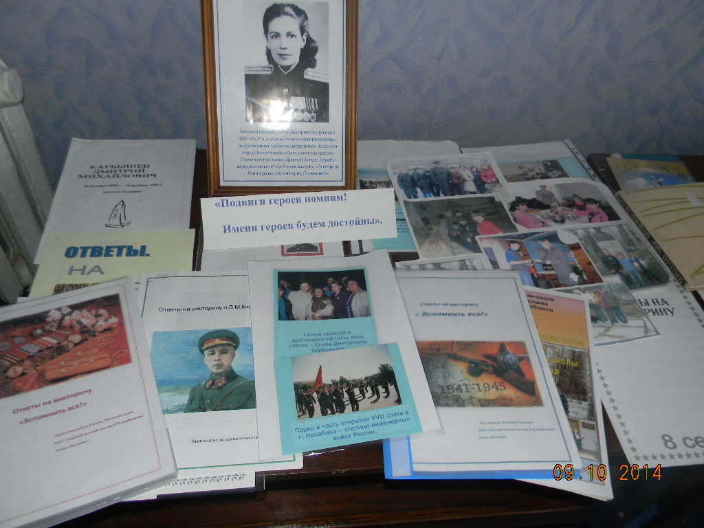 Экспозиция «Вспомним тех, кто легендой овеян» Эта экспозиция посвящена Великой Отечественной войне и её участникам. На выставке представлены экспонаты, привезённые воспитанниками детского дома из поездок по местам боёв и городам – героям. Это гильзы снарядов, осколки гранат, солдатская каска, священная земля, окрашенная кровью наших людей, привезена из Сталинграда, Бреста, а также экспонаты подаренные ветеранами войны и тружениками тыла.