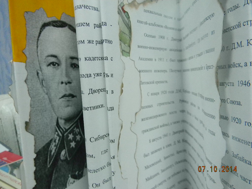 Экспозиция содержит книги с дарственными надписями дочери генерала Е.Д. Карбышевой, её письма в музей, ксерокопии фотографий из личного архива семьи Карбышевых.