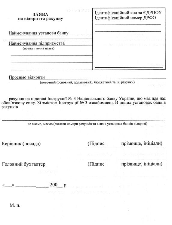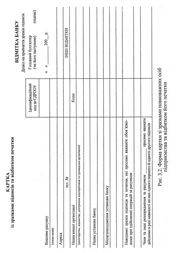 Ведення банками рахунків клієнтів є необхідною передумовою та важливою складовою їх розрахунково-касового обслуговування. весь процес ведення рахунків умовно можна розділити на три стадії: відкриття, обслуговування, закриття рахунків. Відкриття рахунків. Для зберігання грошових коштів та здійснення всіх видів операцій банки відкривають своїм клієнтам кілька видів рахунків: поточні, депозитні (вкладні), бюджетні. Перші два види рахунків можуть відкриватися в національній та іноземній валюті, а останній – тільки в національній. Банки відкривають рахунки у національній валюті для таких груп клієнтів: · юридичні особи та фізичні особи – суб'єкти підприємницької діяльності (далі – підприємства) – резиденти, зареєстровані в установленому порядку; · філії, представництва, відділення, інші відокремлені підрозділи підприємств-резидентів, зареєстровані в установленому порядку (далі – підрозділи підприємств); · представництва юридичних осіб-нерезидентів, іноземні інвестори. · фізичні особи (резиденти та нерезиденти). У веденні рахунків цих чотирьох груп клієнтів є як спільні риси, так і певні відмінності, передбачені чинними нормативними актами Національного банку України. Установи банків та їхні клієнти при веденні рахунків повинні чітко дотримуватися вимог указаних нормативних актів. Поточні рахунки в національній валюті банки відкривають підприємствам усіх видів та форм власності, їх відокремленим підрозділам, представництвам фірм-нерезидентів, фізичним особам для приймання і зберігання їхніх власних грошових коштів та для здійснення всіх розрахунково-касових операцій з ними. Ці рахунки найчастіше використовуються у банківській практиці, за ними здійснюється переважна частина міжгосподарських платежів та платежів населення, що проходять через банківську систему. До поточних належать також карткові рахунки, за якими здійснюються операції за платіжними картками. Підприємство, одержавши згоду вибраного банку на розрахунково-касове обслуговування, Подає йому такі документи для відкриття рахунку: 1. заяву за встановленою формою, підписану керівником та головним бухгалтером підприємства (див. рис. 3.1); 2. засвідчену нотаріально копію свідоцтва про державну реєстрацію; 3. засвідчену нотаріально копію зареєстрованого статуту; 4. копію документа, що підтверджує взяття підприємства на облік податковим органом; 5. картку зі зразками підписів осіб, яким надано право розпоряджатися рахунком та підписувати розрахунково-касові документи (див. рис. 3.2); 6. нотаріально засвідчену копію документа про реєстрацію підприємства в органах Пенсійного фонду України. Якщо підприємство створене як господарське товариство, колективне підприємство чи громадське об'єднання, то воно зобов'язане подати банку також нотаріально засвідчену копію установчого договору чи копію протоколу загальних зборів засновників. Орендні підприємства подають також засвідчену нотаріально