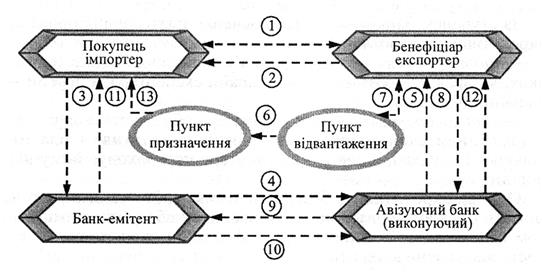 Рис. 8.3. Схема розрахунку акредитивом Після укладення контракту експортер готує товар до відвантаження, про що повідомляє імпортера (2). Одержавши повідомлення експортера, покупець направляє своєму банку заяву про відкриття акредитива, в якій указує умови платежу (3), що містяться в контракті. Після оформлення відкриття акредитива банк-емітент направляє акредитив до іноземного банку, як правило, до банку, що обслуговує експортера (4), — авізуючого банку. Авізуючий банк, перевіривши достовірність одержаного акредитива, сповіщає експортера про відкриття та умови акредитива (5). Експортер перевіряє відповідність умов акредитива платіжним умовам укладеного контракту. Якщо експортер приймає умови відкритого на його користь акредитива, він відвантажує товар в указані в контракті строки (6). Одержавши від транспортної організації транспортні документи (7), експортер подає їх разом з іншими документами, передбаченими акредитивом, до свого банку (8). Банк перевіряє відповідність поданих документів умовам акредитива, повноту документів, правильність їх оформлення. Перевіривши документи, банк експортера відсилає їх банку-емітенту (9) для оплати або акцепту. У супроводжувальному листі вказується порядок зарахування виручки на рахунок експортера. Отримавши документи, банк-емітент ретельно перевіряє їх переказує суму платежу банку, Ідо обслуговує експортера (10). На суму платежу дебетується рахунок імпортера (11). Банк експортера зараховує виручку на рахунок експортера (12). Імпортер, отримавши від банку-емітента комерційні документи (13), вступає у володіння товаром. За ступенем банківського забезпечення платежу для продавця акредитиви поділяються на: ¾ підтверджені — тверде зобов'язання двох банків (один з яких, як правило, розташований у країні експортера, а другий — у країні покупця); ¾ непідтверджені — банк експортера обмежується лише повідомленням експортера про відкриття акредитива і платить тільки у тому разі, якщо банк імпортера перераховує йому відповідну суму. Обидва акредитиви є безвідкличними, тобто такими, що не можуть бути анульованими (відкликаними) або заміненими банком імпортера до настання строку без згоди експортера, на користь якого вони відкриті. Акредитив у зовнішній торгівлі має бути безвідкличним, оскільки відкличний дає змогу іноземному покупцю, навіть після відвантаження товарів, скоригувати або навіть відмінити цей акредитив без попереднього повідомлення експортера. Безвідкличний акредитив може бути скоригованим або відміненим тільки після отримання згоди всіх сторін цього акредитива. Усе частіше в міжнародній банківській практиці застосовується трансферабельний (переказний) акредитив. Він дає змогу здійснювати платежі не тільки на користь бенефіціара, а й третіх осіб. Якщо умовами акредитива не передбачена можливість його переказування, а бенефіціар за акредитивом не є постачальником товару, в розрахунках може бути використано компенсаційний акредитив. Він відкривається бенефіціаром за основним, базисним акредитивом як зустрічний акредитив на користь виробника товару або субпостачальника. Базисний та компенсаційний акредитиви є самостійними і з правового погляду не зв'язані між собою. При постійних поставках товару рівними партіями в розрахунках може бути використано револьверний (поновл