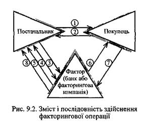 Факторинг — це операція, яка поєднує у собі низку посередницько-комісійних послуг з кредитуванням оборотного капіталу суб'єкта господарювання. Основою факторингу є перевідступлення першим кредитором прав вимоги боргу третьої особи другому кредитору з попередньою або наступною компенсацією вартості такого боргу першому кредитору. Фактично банк (факторингова компанія) купує рахунки-фактури постачальника за відвантажену продукцію, виконані роботи чи надані послуги. факторингові операції, крім купівлі права на вимогу боргу, включають: —кредитування у вигляді попередньої оплати боргових вимог; —ведення бухгалтерського обліку постачальника, зокрема реалізації продукції (роботи, послуг); —інкасування дебіторської заборгованості постачальника; —страхування постачальника від кредитного ризику. Учасниками факторингової операції можуть бути: —посередник (фактор), тобто комерційний банк або факторингова компанія; —постачальник товарів (робіт, послуг); —покупець. Відносини між суб'єктами факторингу регулюються договором, який укладається у письмовій формі між фактором і постачальником. У ньому дається перелік істотних умов, до яких, зокрема, належать ті, що захищають інтереси сторін — взаємні зобов'язання і відповідальність сторін, розмір кредиту і плати за факторингове обслуговування, вид факторингу. Оскільки факторингові операції мають ризикований характер, то перед укладенням договору фактор ґрунтовно вивчає фінансово-господарську діяльність клієнта-постачальника. Оцінка фінансового стану підприємства впливає на прийняття фактором позитивного рішення про укладення факторингової угоди та її зміст. Факторингові операції можна класифікувати за багатьма ознаками. За сектором ринку, де здійснюються факторингові операції, розрізняють внутрішній та зовнішній (міжнародний) факторинг. Внутрішній факторинг передбачає, що постачальник, покупець і фактор перебувають під юрисдикцією однієї країни. При зовнішньому факторингу суб'єкти факторингової угоди перебувають під юрисдикцією різних країн. Залежно від того, чи повідомляються дебітори клієнта про пе-ревідступлення ним прав вимоги боргу, факторинг може бути конвенційним (відкритим) та конфіденційним (закритим). При відкритому факторингу дебіторам клієнта повідомляється про укладення договору факторингу і пропонується здійснювати платежі безпосередньо фактору. Закритий факторинг не передбачає повідомлення дебіторів, ніхто з них не знає про перевідступлення постачальником прав вимоги боргу, і тому кошти переказуються постачальнику, який розраховується з фактором самостійно. Залежно від характеру взаємовідносин між фактором і постачальником, що складаються у разі відмови покупця від оплати боргових вимог, розрізняють факторинг з правом регресу та факторинг без права регресу. У першому випадку постачальник несе ризики за борговими вимогами, які придбав у нього фактор. Мова йде про те, що факторинг з правом регресу дозволяє фактору повернути постачальникові неоплачені покупцем боргові вимоги і вимагати від нього повернення грошових коштів фактору. Факторинг без права регресу означає, що фактор бере на себе ризик щодо одержання грошових коштів від покупців. За набором послуг, що включає факторинг, він може бути з повним набором послуг та з частковим н
