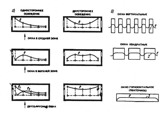 Рис. 12 Классификация приемов бокового освещения через окна (а) и типы окон (б) 1, 2 - большая и средняя неравномерность освещения; 3 - равномерное освещение (показано кривой КЕО)