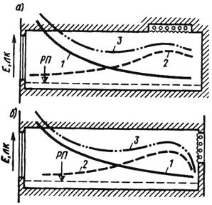 Рис 13 Кривые КЕО совмещенного освещения при использовании светящей панели, расположенной в удаленной зоне потолка (а) и светящей ниши в стене против окна (б) 1 - естественное освещение; 2 - искусственное освещение; 3 - совмещенное освещение.