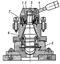 Рис.4.11.Трехкулачковый самоцентрирующий патрон: Наиболее широко распространен трехкулачковый самоцентрирующий патрон (рис. 4.11). Кулачки 7, 2 и 3 патрона перемещаются одновременно с помощью диска 4. На одной стороне этого диска выполнены пазы (имеющие форму архимедовой спирали), в которых расположены нижние выступы кулачков, а на другой — нарезано коническое зубчатое колесо, сопряженное с тремя коническими зубчатыми колесами 5. При повороте ключом одного из колес 5 диск 4 (благодаря зубчатому зацеплению) также поворачивается и посредством спирали перемещает одновременно и равномерно все три кулачка по пазам корпуса 6 патрона. В зависимости от направления вращения диска кулачки приближаются к центру патрона или удаляются от него, зажимая или освобождая деталь. Кулачки обычно изготовляют трехступенчатыми и для повышения износостойкости закаливают. Различают кулачки крепления заготовок по внутренней и наружной поверхностям; при креплении по внутренней поверхности заготовка должна иметь отверстие, в котором могут разместиться кулачки. В трехкулачковых самоцентрирующих патронах закрепляют заготовки круглой и шестигранной формы или круглые прутки большого диаметра. В двухкулачковых самоцентрирующих патронах закрепляют различные фасонные отливки и поковки; кулачки таких патронов, как правило, предназначены для закрепления только одной детали. В четырехкулачковых самоцентрирующих патронах закрепляют прутки квадратного сечения, а в патронах с индивидуальной регулировкой кулачков — детали прямоугольной или несимметричной формы.