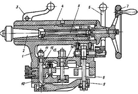 2.6 Задняя бабка. Устройство задней бабки показано на рисунке 7. В корпусе 1 (при вращении винта 5 маховиком 7) перемещается пиноль 4, закрепляемая рукояткой 3. В пиноли устанавливается центр 2 с коническим хвостовиком (или инструмент). Задняя бабка перемещается по направляющим станка вручную или с помощью продольного суппорта. В рабочем неподвижном положении задняя бабка фиксируется рукояткой 6, которая соединена с тягой 8 и рычагом 9. Сила прижима рычага 9 тягой 8 к станине регулируется гайкой 11 и винтом 12. Более жесткое крепление з