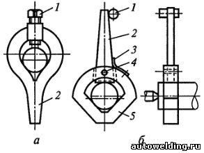 Рис.4.14. Токарные хомутики: Хомутики (рис. 4.14) служат для передачи вращения от шпинделя к обрабатываемой заготовке, установленной в центрах станка. Хомутик надевают на заготовку и закрепляют винтом 1 (рис. 4.14, а), при этом хвостовик 2 хомутика упирается в палец поводкового патрона. При обработке заготовки в центрах передачу движения ей может осуществлять поводковый патрон через палец-поводок и хомутик, который крепится на детали винтом. Для сокращения вспомогательного времени при черновой обработке в центрах валов диаметром 15...90 мм применяют самозажимные поводковые патроны. Цанговые патроны применяют главным образом для закрепления холоднотянутого прутка или для повторного зажима заготовок по предварительно обработанной поверхности. Мембранные патроны применяют в том случае, когда необходимо обработать партию заготовок с высокой точностью центрирования. Способ установки и закрепления заготовок на станке выбирают в зависимости от их размеров, жесткости и требуемой точности обработки. При соотношении l/D < 4 (где l — длина обрабатываемой заготовки, мм; D — диаметр заготовки, мм) заготовки закрепляют в патроне, при 4 < l/D< 10 — в центрах или в патроне с поджимом задним центром (рис. 4.15), при l/D> 10 — в центрах или в патроне и центре задней бабки и с поддержкой люнетом (рис. 4.16).