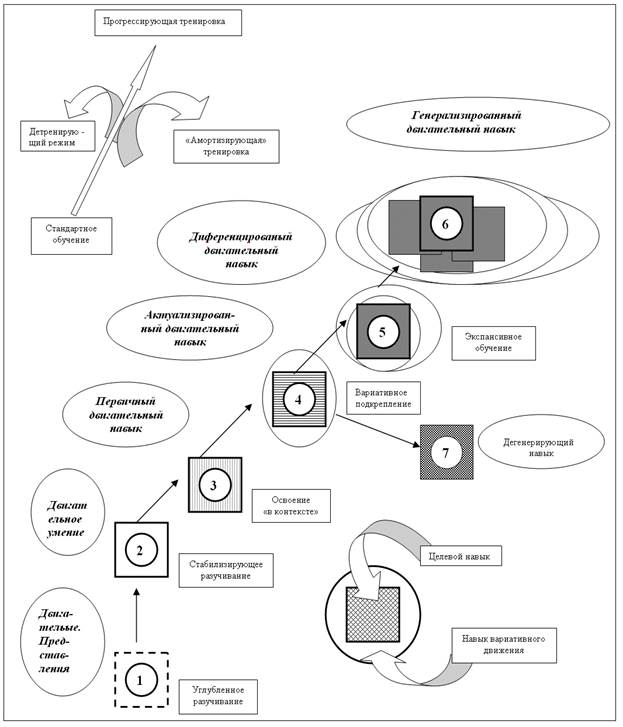 Рис. 2. Уровни освоения (владения) движением и его динамика при учебно-тренировочной работе разного вида (Смолевский, Гавердовский, 1999)