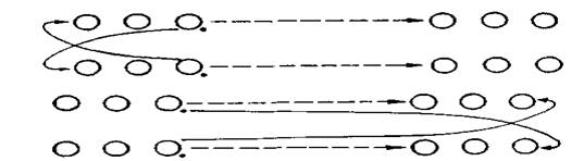 1. Имитация фаз выполнения передачи мяча на месте и с разбега. 2. Имитация целостного выполнения передачи мяча. 3. Передача мяча в стену с места (расстояние 6—7 м) и его ловля. 4. Передача мяча в стену (расстояние 6—7 м) с разбега и его ловля. 5. Занимающиеся построены в две шеренги на расстоянии 10— 12 м лицом друг к другу. 6. Передача мяча в парах после трех шагов. (Рис. 17). 7. Передача мяча во встречных колоннах со сменой мест. 8. Передача мяча в парах в движении. Занимающиеся построены в две колонны. Расстояние между партнерами 3-6 м (Рис. 18).
