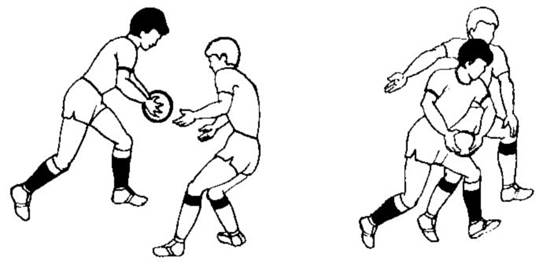 Возможные ошибки: ü неправильно избранно позиция для броска (спиной к воротам или перед защитником); ü отсутствие отталкивания от поверхности площадки (игрок валится в зону вратаря); ü падение перекатом через плечо без группирования; ü выполнение падения на грудь, не сгибая ноги в коленях; ü касание пола свободной рукой до выпуска мяча. Для предотвращения травматизма и снятия напряжения, вызванного боязнью ушибов и др., необходимо подготовить занимающихся: · атлетическая (силовая) подготовка; · акробатическая подготовка – кувырки, полет кувырки (длинные); · специальные упражнения – перекат влево, вправо, падение вперед с последующим приземлением на руки, грудь, живот, бедра. Последовательность освоения броска в падении: 1. Броски мяча из положения сидя (мячи: гандбольные, баскетбольные, набивные гандбольные и др.) 2. Броски из исходного положения стойка на коленях с последующим падением вперед. 3. Бросок в ворота из глубокого приседа с последующим падением вперед на руки. 4. Выполнение броска в падении на грудь в комплексе из низких стоек. 5. То же после финта линейного. 6. То же с позиций крайних игроков; 7. Броски в падении с пассивным защитником; 8. Броски мяча в падении при активной защите. Отвлекающие действия (финты). Отвлекающее действие представляет собой сумму элементарных движений, каждое из которых — единичный моторный акт. Отвлекающее движение телом или рукой с мячом или без мяча, на месте или при перемещении, должно нейтрализовать соперника, побудив его к активной защите до начала истинных действий нападающего. Эти приемы должны осуществляться обманчиво. При этом защитник теряет оптимально устойчивую защитную стойку, из которой мог бы начать успешно противодействовать нападающему. Одно- и двушажное отвлекающее действие — это самые распространенные и вместе с тем наиболее сложные комплексы дезориентирующих движений. Одношажное отвлекающее действие представляет собой ряд последовательно выполняемых движений и состоит из разбега, отвлекающего движения на ведение мяча, смещения тела в противоположную сторону, обхода игрока. Каждое движение зависит от предыдущих и в свою очередь обуславливает успех последующего движения. Игрок двигается в сторону своего защитника и ловит мяч, брошенный ему партнером. В 2—2, 5 м от «опекуна» нападающий с мячом делает правой ногой шаг вперед-вправо, сгибая ее в коленном суставе; мяч находится в двух руках на уровне живота, туловище развернуто в сторону носка правой ноги и слегка наклонено вперед, взгляд устремлен в сторону выставленной вперед-вправо правой ноги. Создается впечатление, что нападающий намерен обойти защитника справа. При этом спортсмен с мячом ставит правую ногу с носка на полную стопу, перенося на нее общий центр тяжести. Продолжая движение, и быстро выпрямляя правую ногу, посылает туловище влево. Одновременно с этим переносит мяч влево и, вместе с шагом левой ноги, начинает ведение левой рукой, обходя защитника слева. Этот прием можно выполнять и на уход вправо. Двушажное отвлекающее действие следует начинать с несколько большего расстояния от защитника, чем одношажное (2, 5—3 м); в остальном движения — те же. Выполняя прием, необходимо внимательно следить за защитником и, если он среагирует на первое движение, прекратить отвлекающее действие и начать перемещение в стор