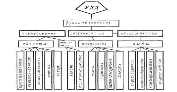 Рис. 1, Система дорожного транспорта [7]: ТС - транспортные средства; ДУ - дорожные условия; ПЕШ - пешеходы (и другие незащищенные участники движения); АП - автомобильные перевозки; ГРД - градостроительство; СМП - специализированная медицинская помощь; КЛТ - культура и туризм; ПДС - придорожный сервис; ПК - подготовка кадров; ПРХ - правоохрана; КХ - коммунальное хозяйство; СВЗ - энергетика и связь; УДТ - управление дорожным транспортом; УДД - управление дорожным движением Возникает вопрос - что же является главной, определяющей подсистемой в системе дорожного транспорта? Мы считаем, что центральное место занимает подсистема управления движением, поскольку именно в дорожном движении производится транспортная услуга. Что же такое управление дорожным движением? Прежде чем ответить на этот вопрос, попытаемся привести некоторые определения, которые позволят внести большую смысловую ясность в применяемой терминологии. Сразу же оговоримся, что приведенные определения, являются сугубо рабочими и действуют лишь в пределах данной работы. Исследование - получение необходимой и достоверной информации. Регулирование — непосредственное воздействие на участников движения с целью формирования заданных характеристик дорожного движения. Обслуживание - создание необходимых предпосылок для реализации исследования и регулирования. Управление дорожным движением - деятельность по формированию заданных характеристик дорожного движения, включающая исследование, регулирование и обслуживание. Организация дорожного движения - деятельность но формированию заданных характеристик дорожного движения, включающая управление дорожным движением и воздействие па условия движения. \ Условия движения - совокупная обстановка, в которой происходит дорожное движение, включающая дорожные условия, транспортно-пешеходную нагрузку, регулирование, состояние транспортных средств, уровень подготовки участников движения и т.д. Дорожные условия - составная часть условий движения, связанная исключительно с подсистемой «Дороги». Управление дорожным транспортом - деятельность по координации работы в системе дорожного транспорта, направленной на удовлетворение потребности в транспортной услуге и минимизацию ее стоимости. Подсистема управления дорожным движением довольно обширна и многогранна. На